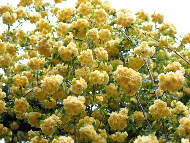 Floraison : en mai ; blanche ou jaune, simple ou double selon les variétés ;